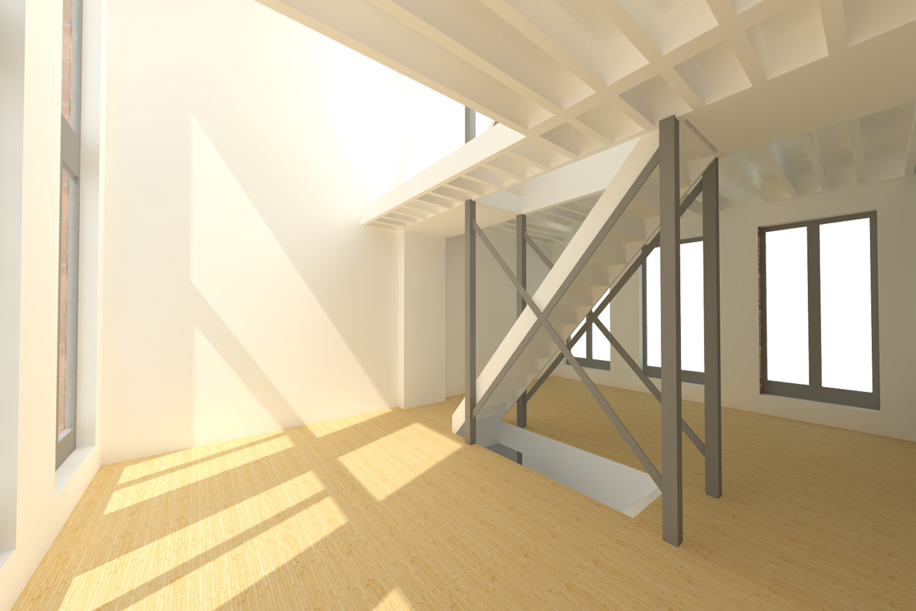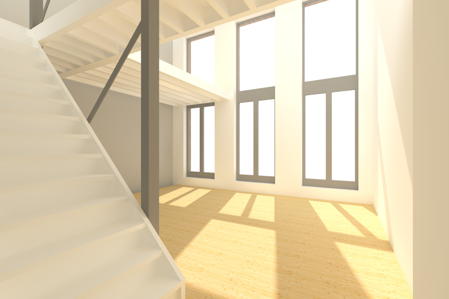 The house is constructed from a smart wood construction system with the wooden floor beams in sight everywhere.
