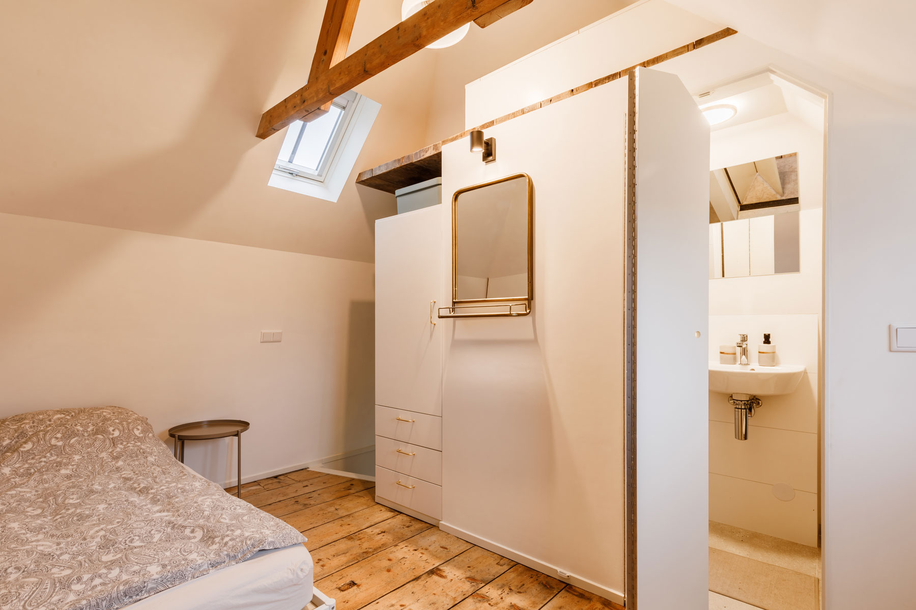 The upper-floor apartment is only 32 m², which posed the challenge of creating an optimal layout, comparable to a tiny house. This was achieved by pushing the kitchen through the rear facade into a small extension on the first floor.