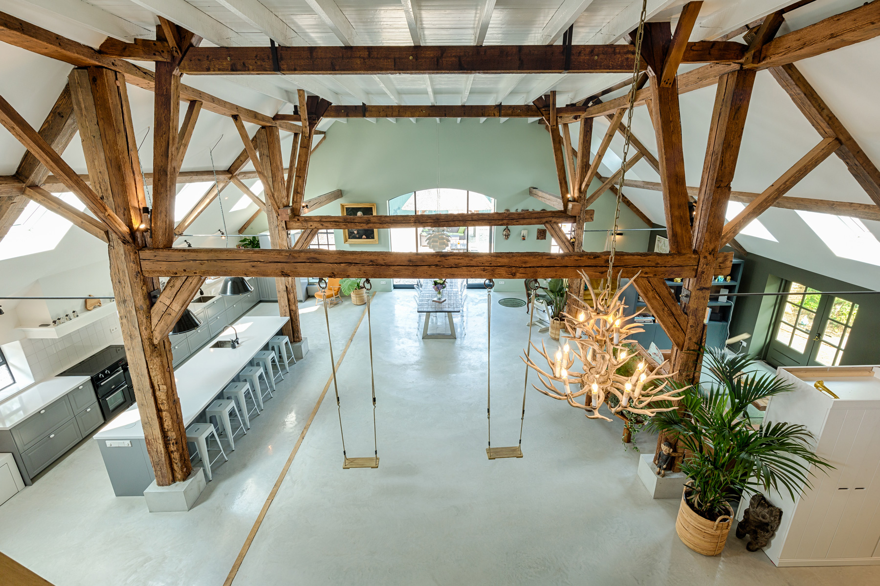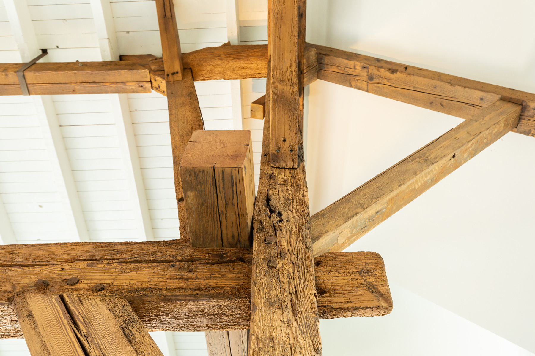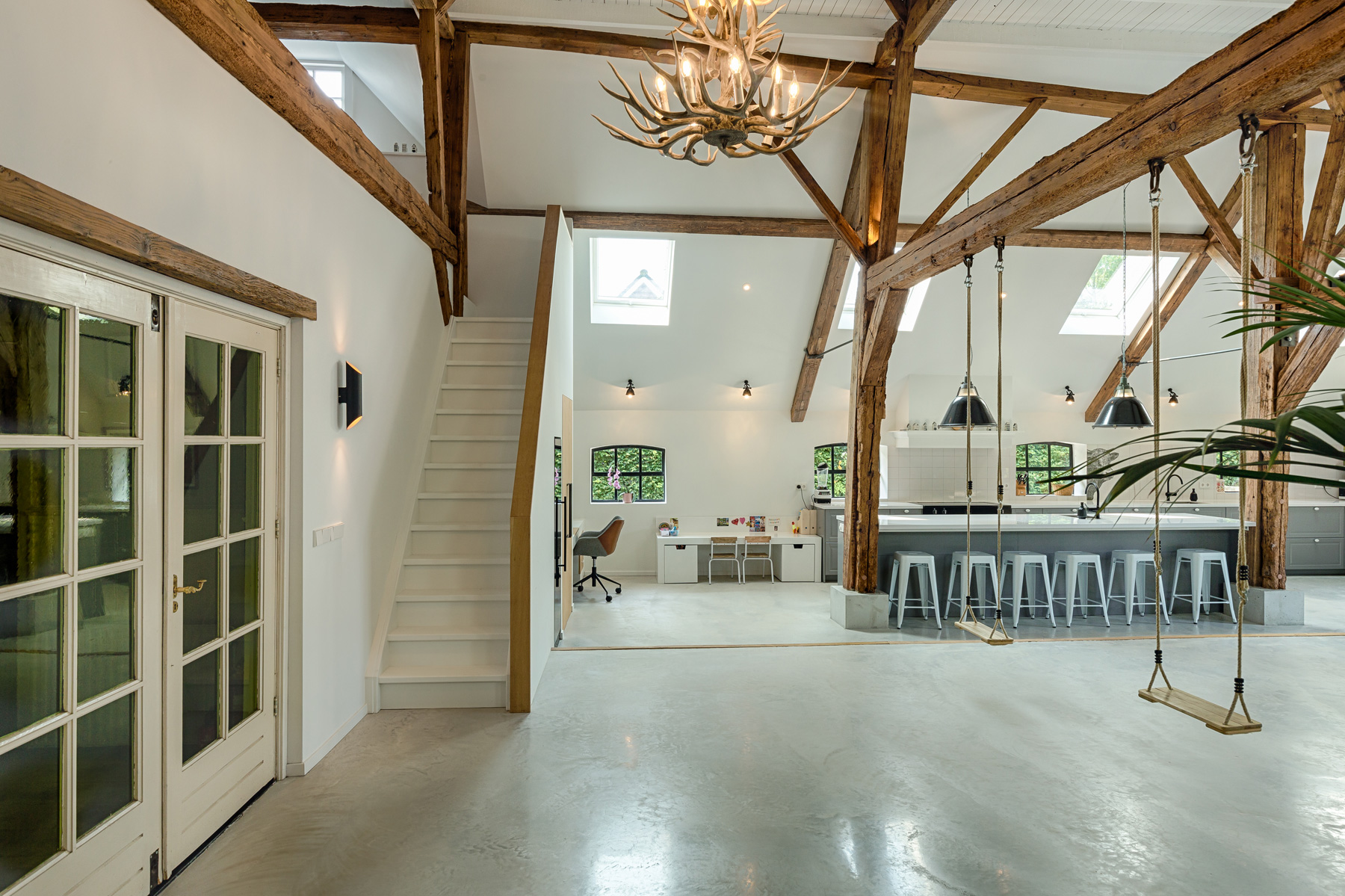 Het zeventiende eeuwse casco van de stal is hersteld, verstevigd en aangevuld met bijpassend hout.