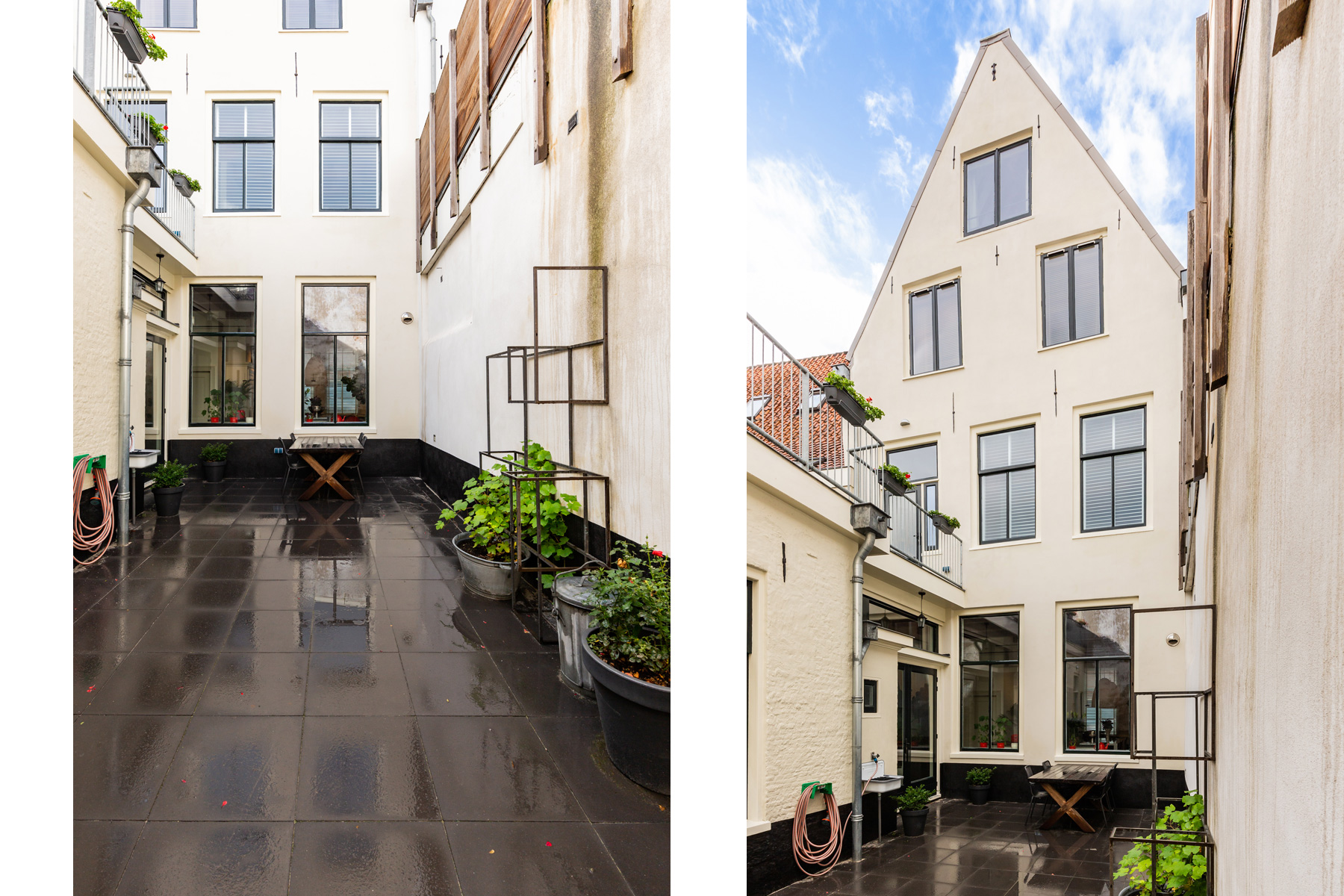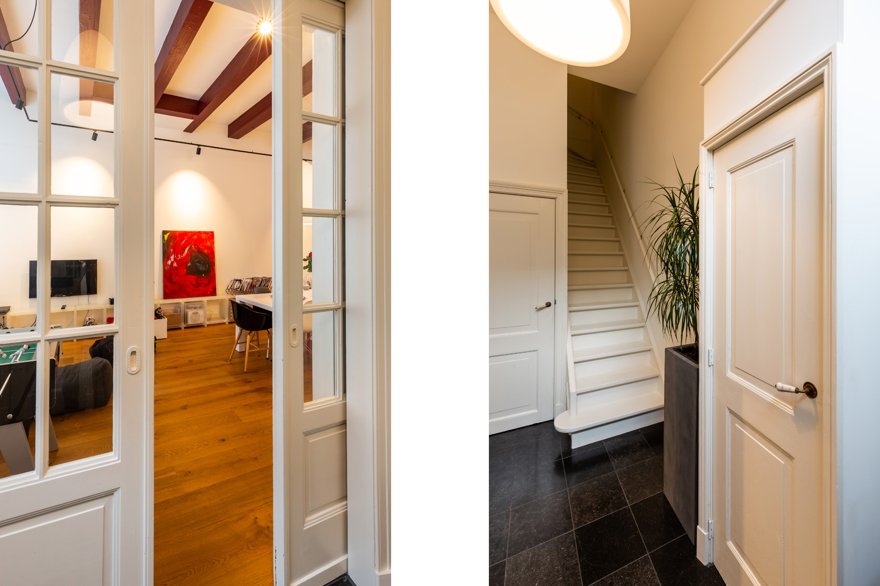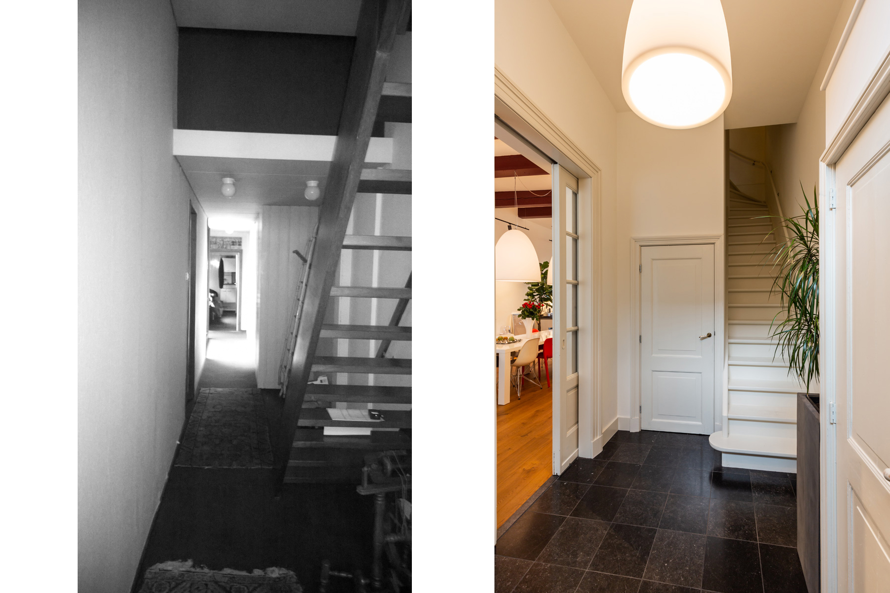 Na het afpellen van alle lagen is het pand van binnen en buiten weer geheel hersteld naar de grandeur die van een dergelijk pand verwacht mag worden.