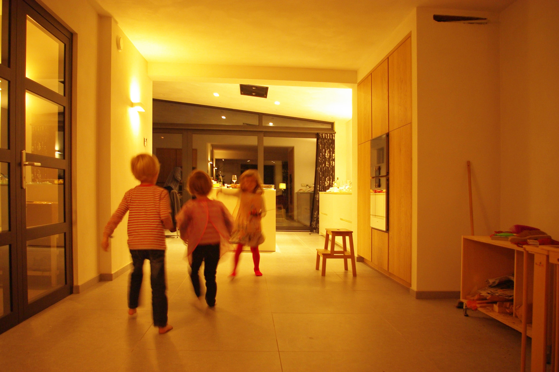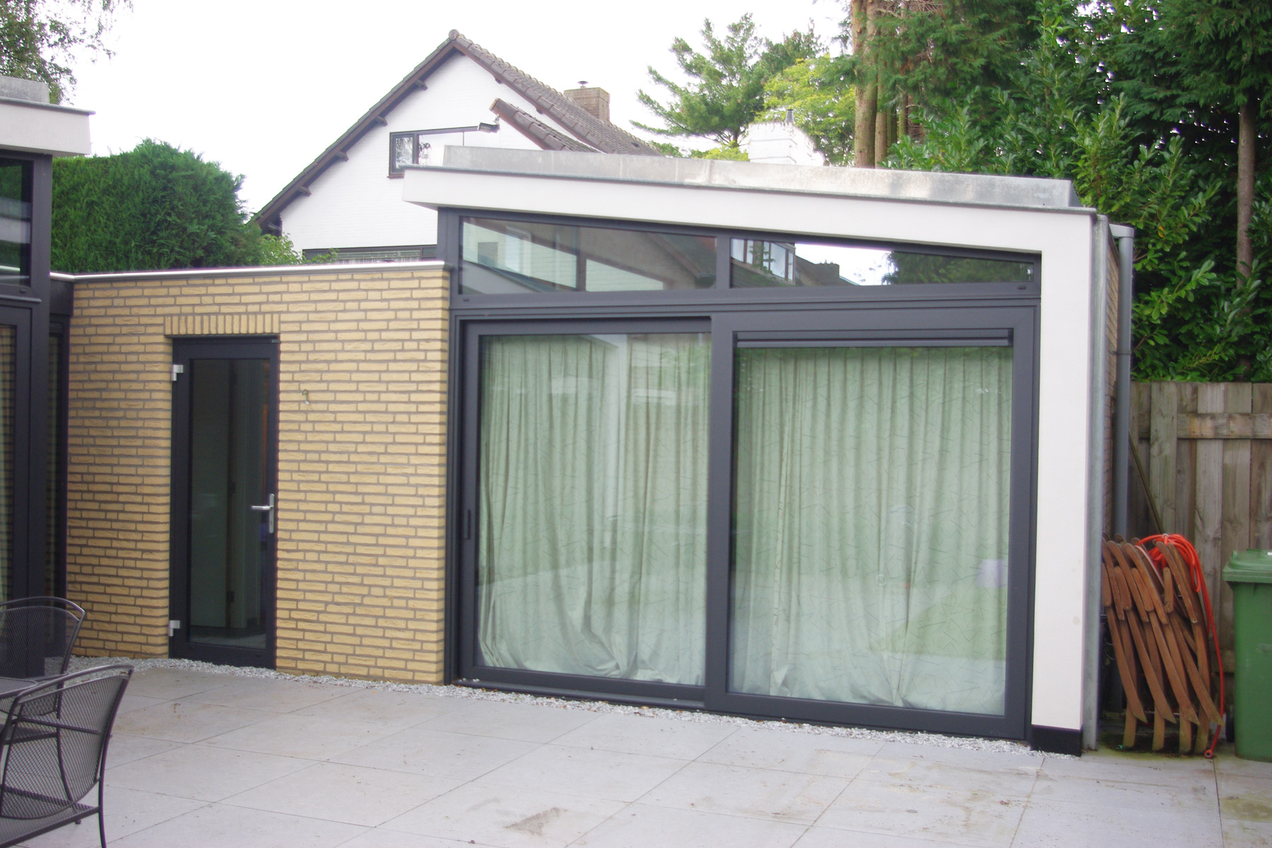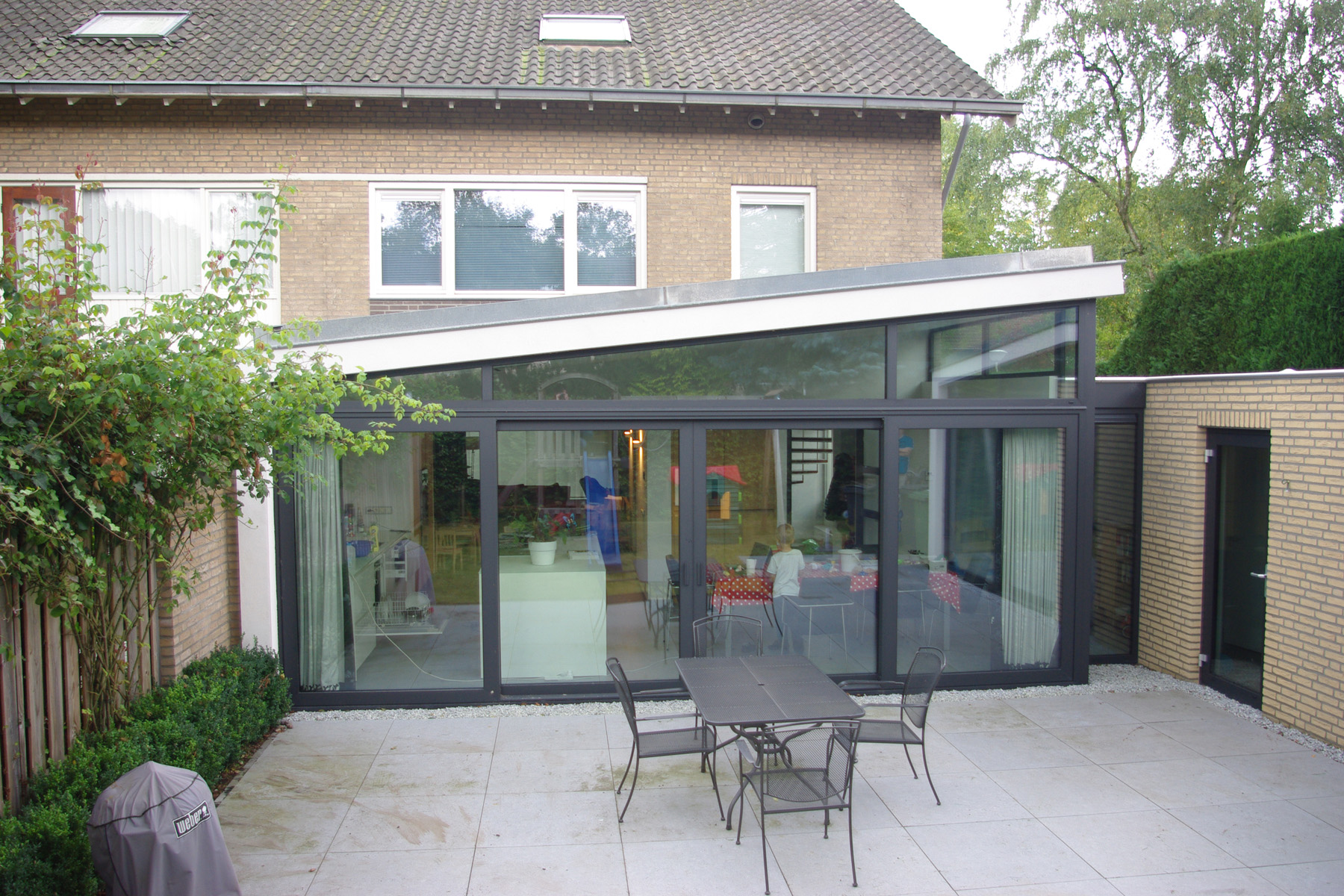 De tuin ligt op het noorden en de woonruimtes aan de tuin waren daardoor donker en somber. Door de aanbouw en de speelkamer in de garage te voorzien van schuin oplopende daken met lichthappers op het zuiden en westen wordt zonlicht en vrolijkheid in het leefgedeelte gebracht.