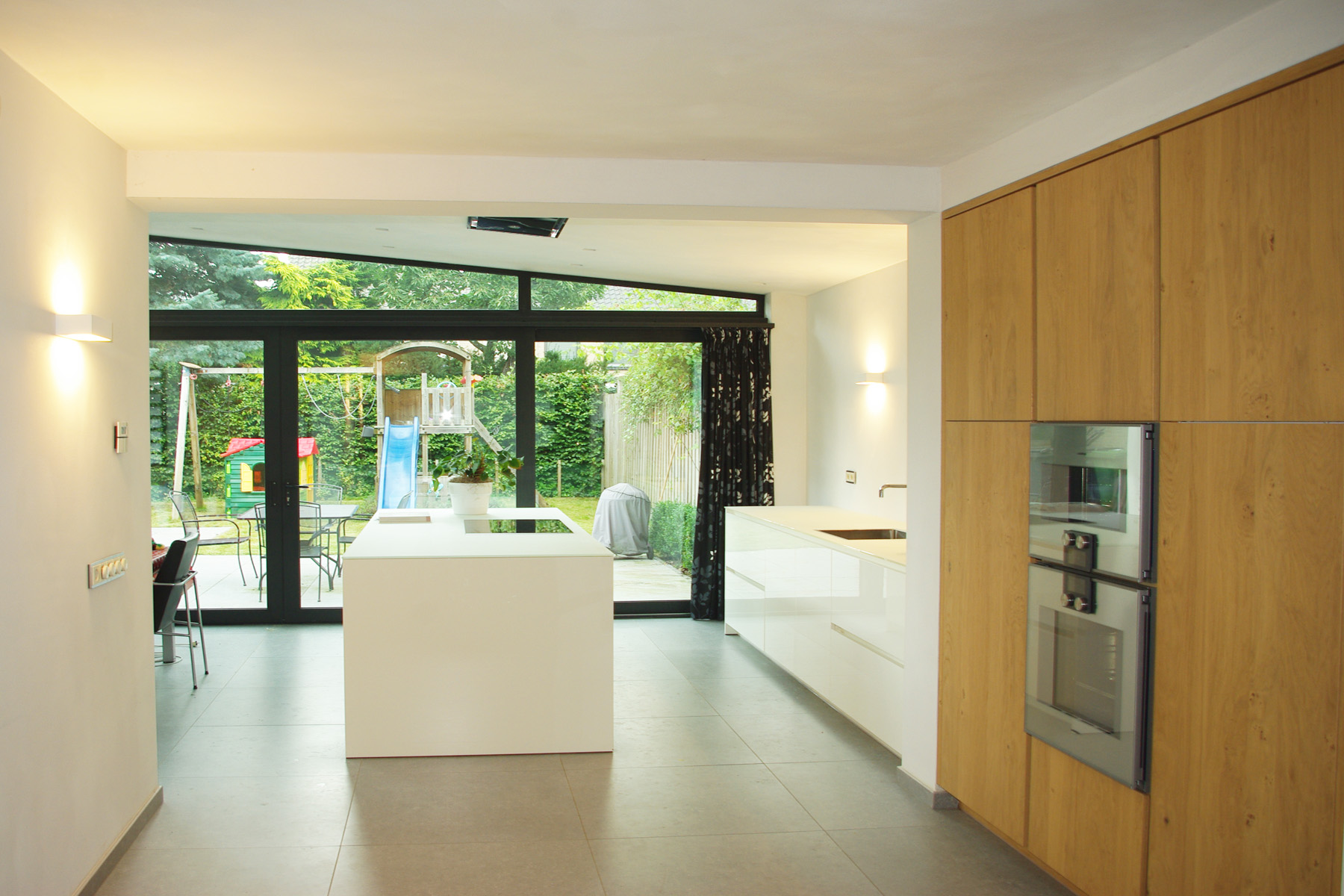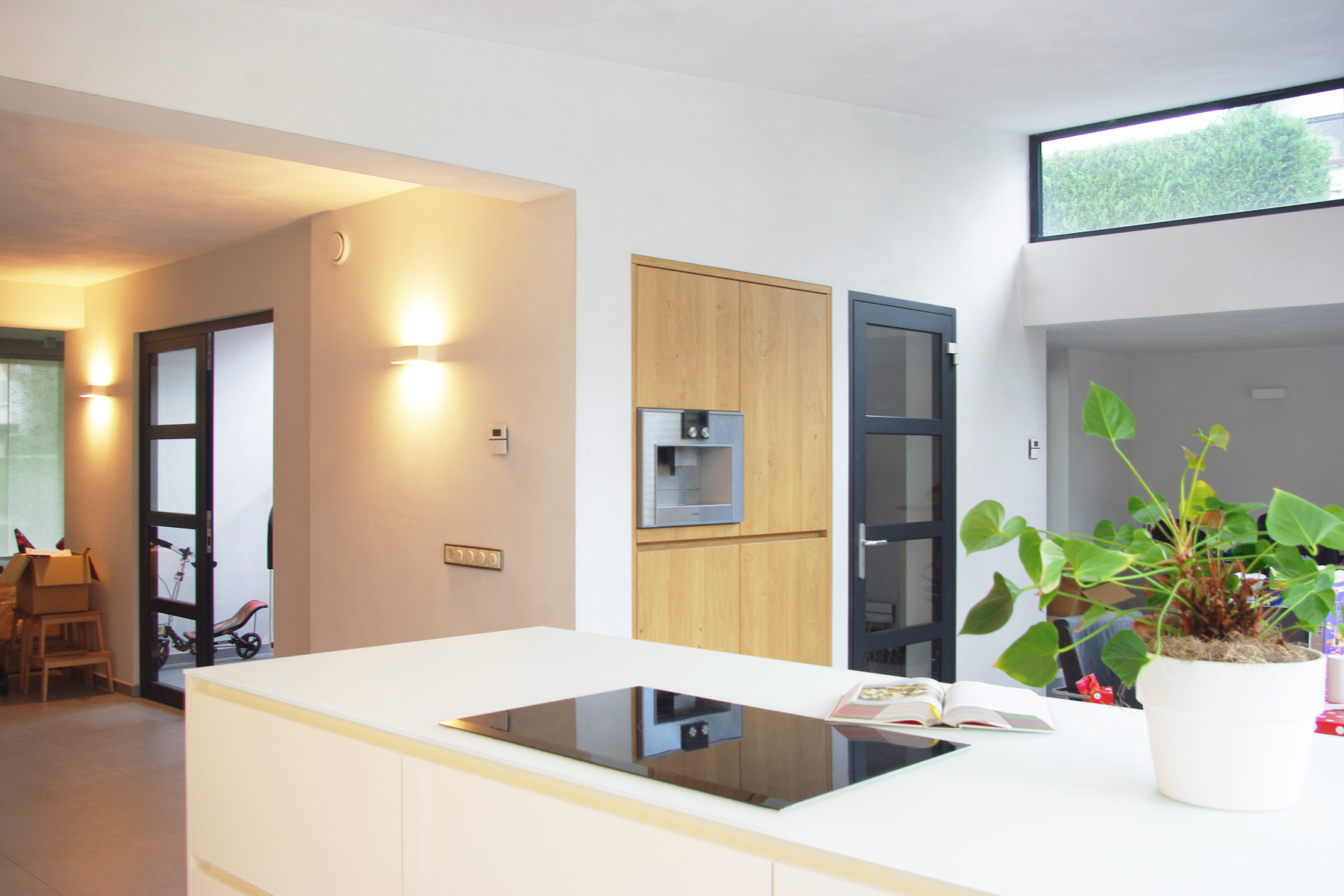 MW architectuur heeft een twee-onder-éénkap-woning uit de jaren zeventig in Eindhoven van binnen geheel gemoderniseerd, de garage verbouwd tot leefruimte en de woning uitgebreid met een aanbouw en speelkamer/ logeerkamer met badkamer.
