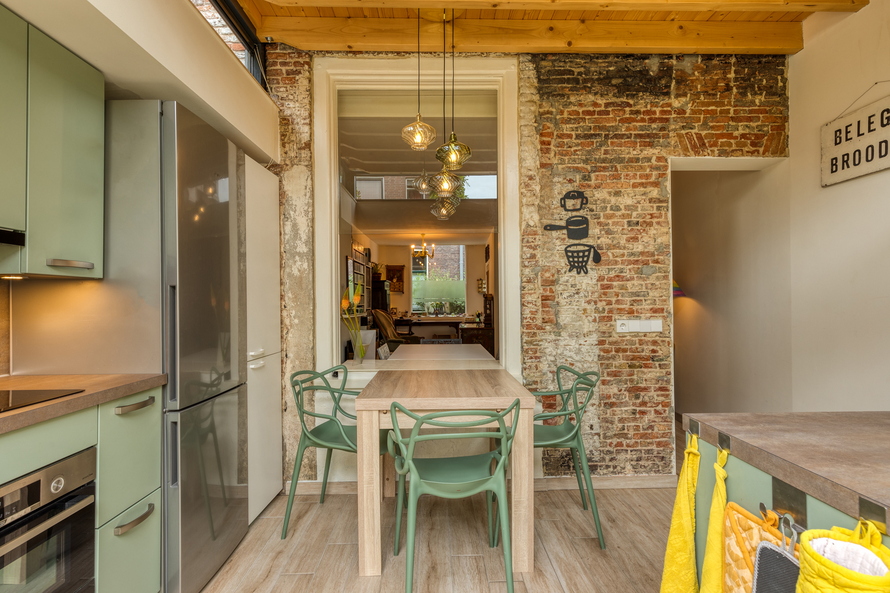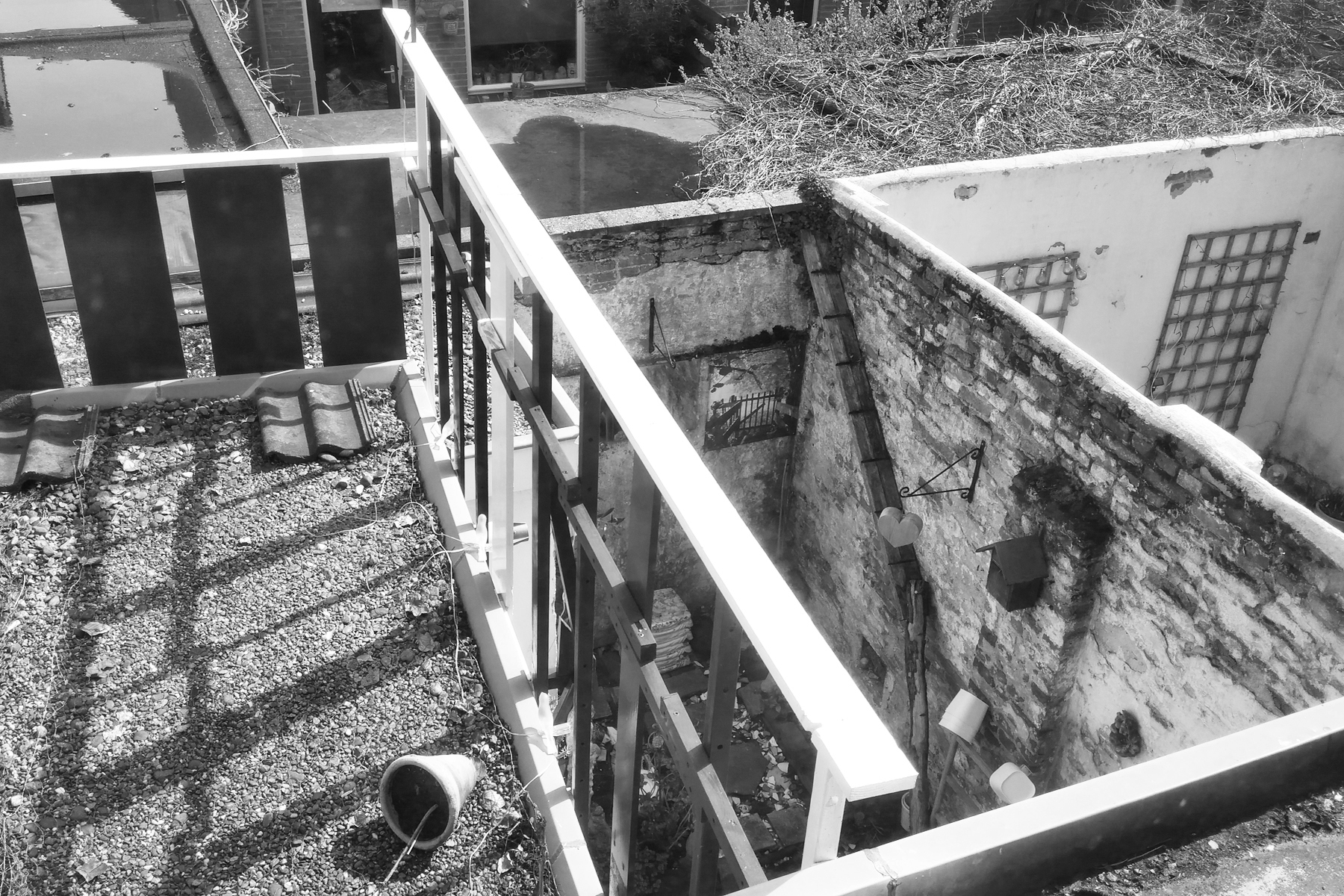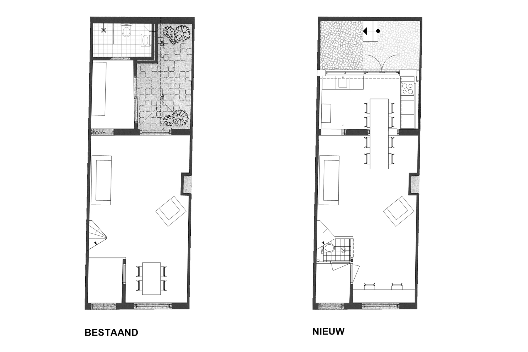 Door de oude uitbouw met keuken en badkamer te slopen en dit volume een kwartslag te draaien is een kleine binnenhof tussen oude tuinmuren ontstaan.