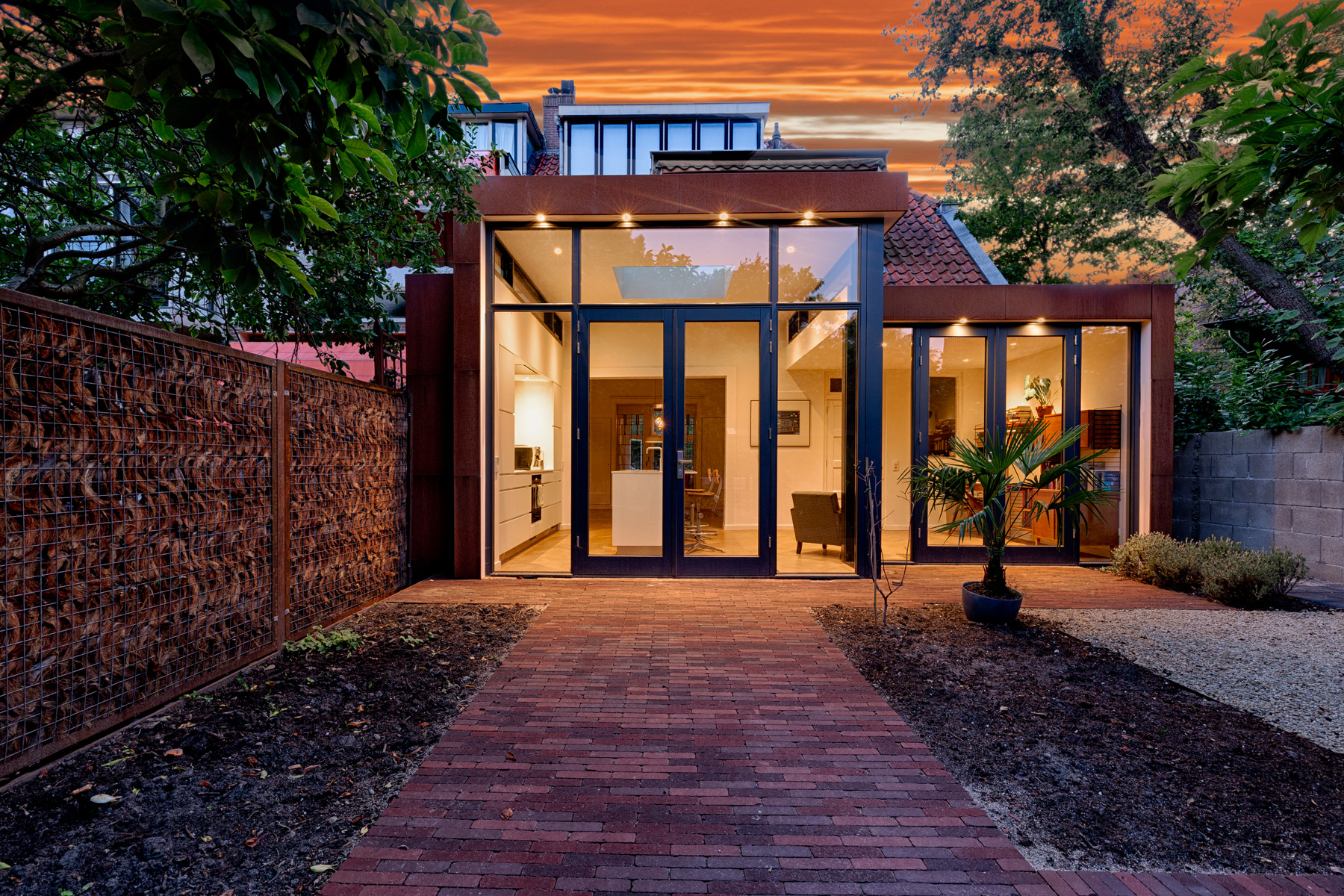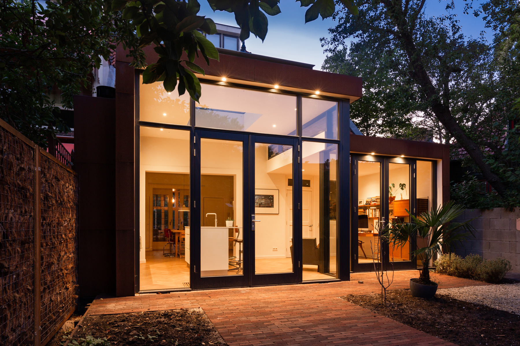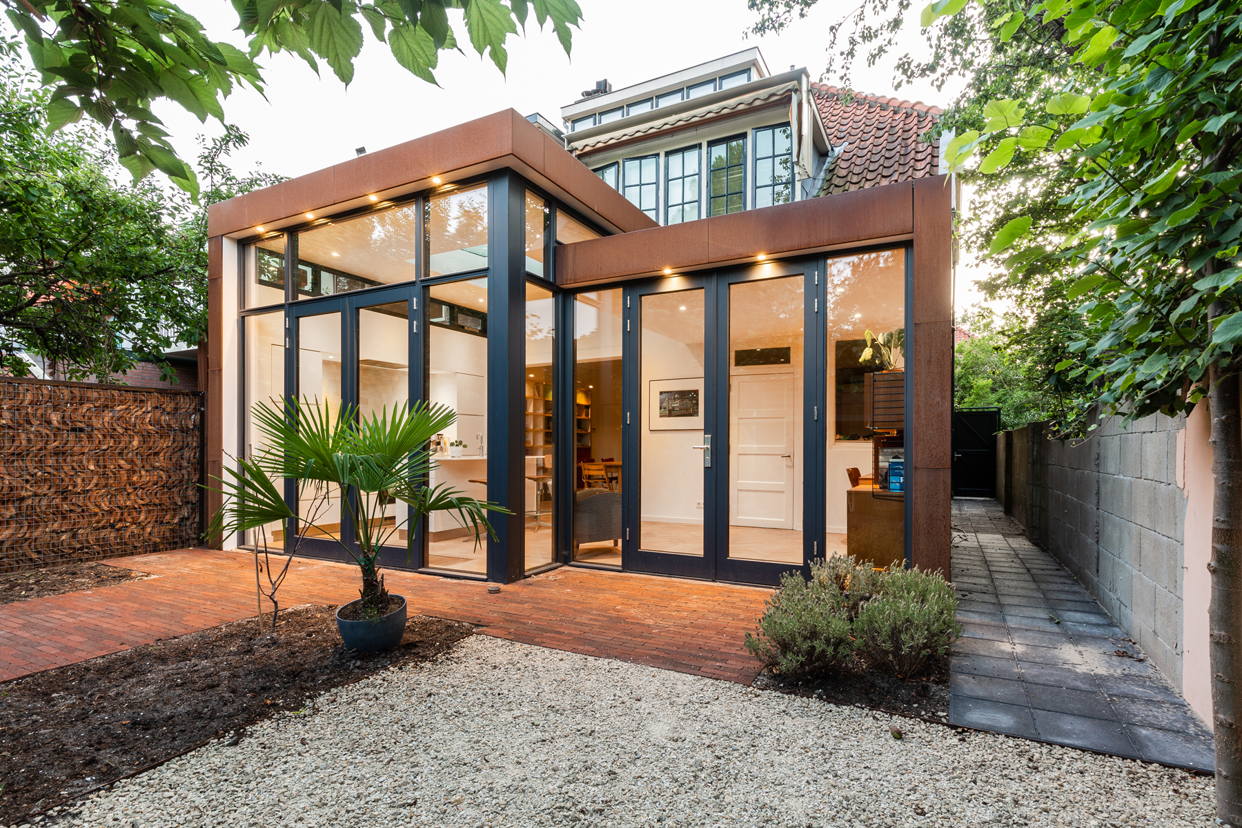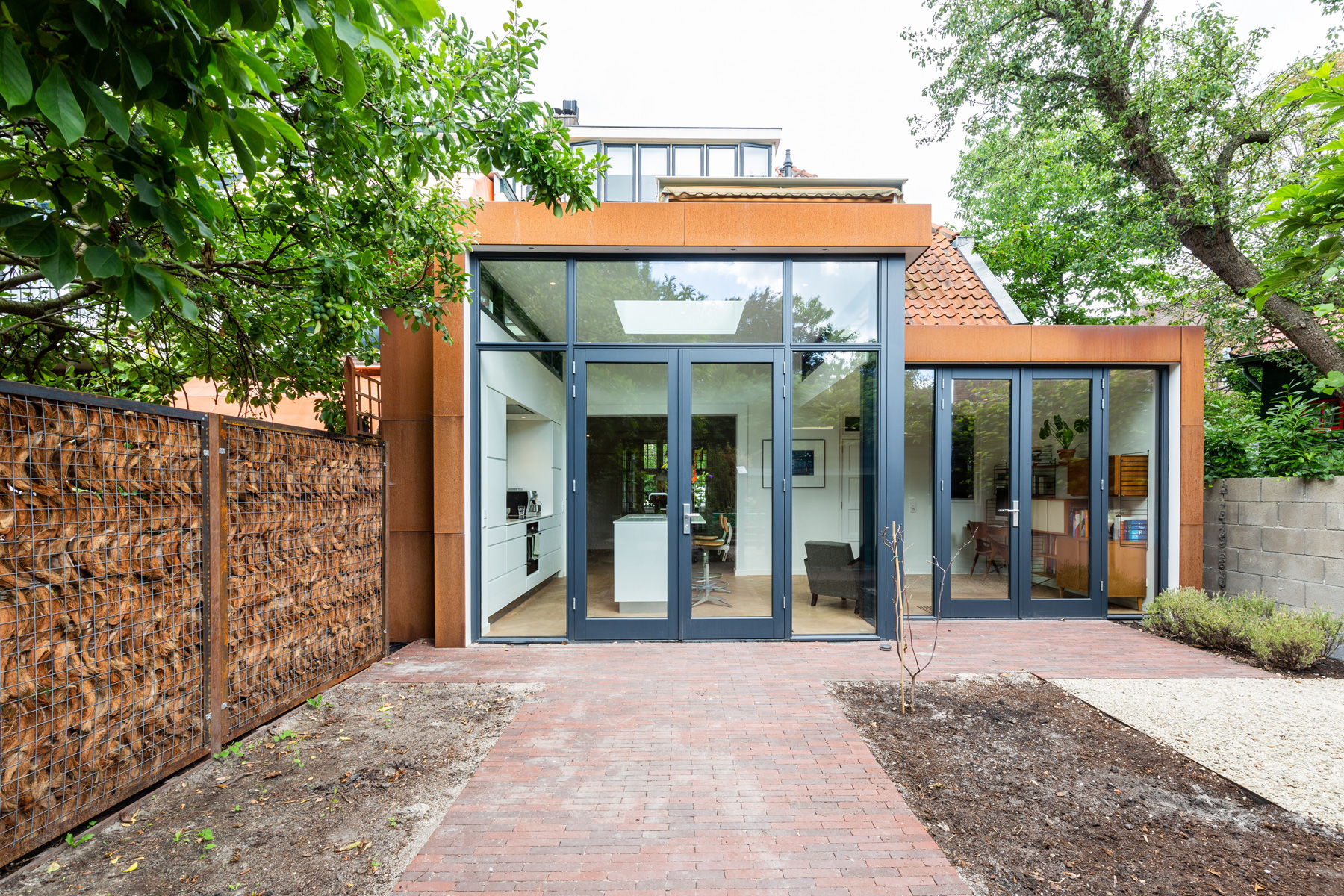 Eye-catcher is de cortenstalen bekleding die prachtig niet alleen aansluit bij het bestaande metselwerk en pannendak, maar ook bij de bomen en groen in de tuin.