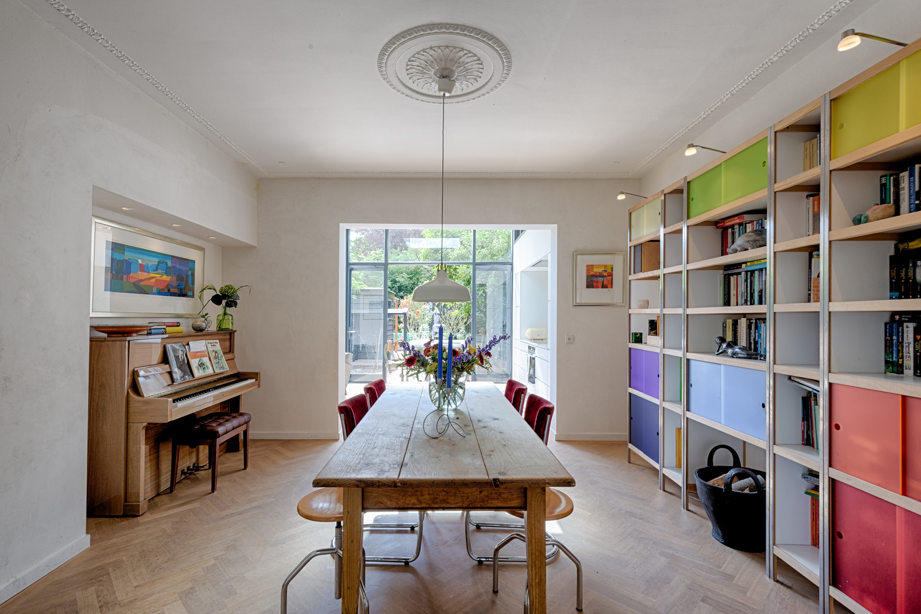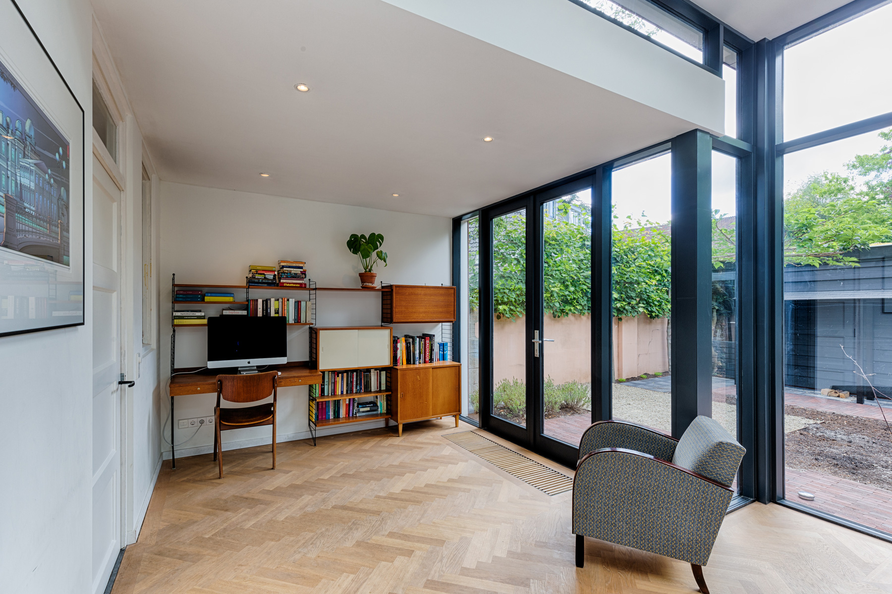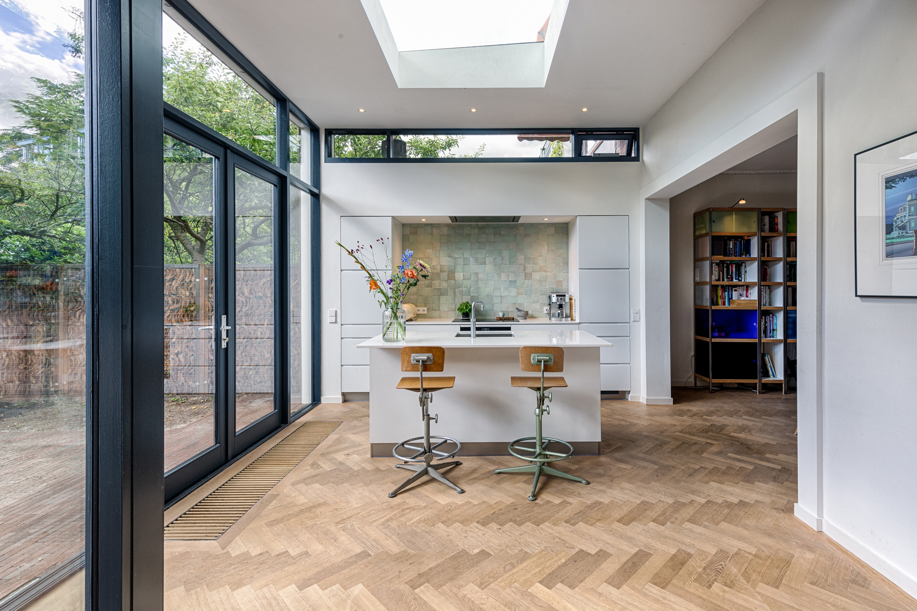 Door een nieuwe uitbouw te maken die veel zicht geeft op de tuin is samenhang ontstaan tussen tuin en leefruimte binnen. De verschillende hoogtes geven ruimte om licht van beide zijkanten binnen te laten komen. Tegelijkertijd sluit de aanbouw daardoor goed aan bij de schaal van de originele architectuur en wordt de hoogte voor buren geminimaliseerd.