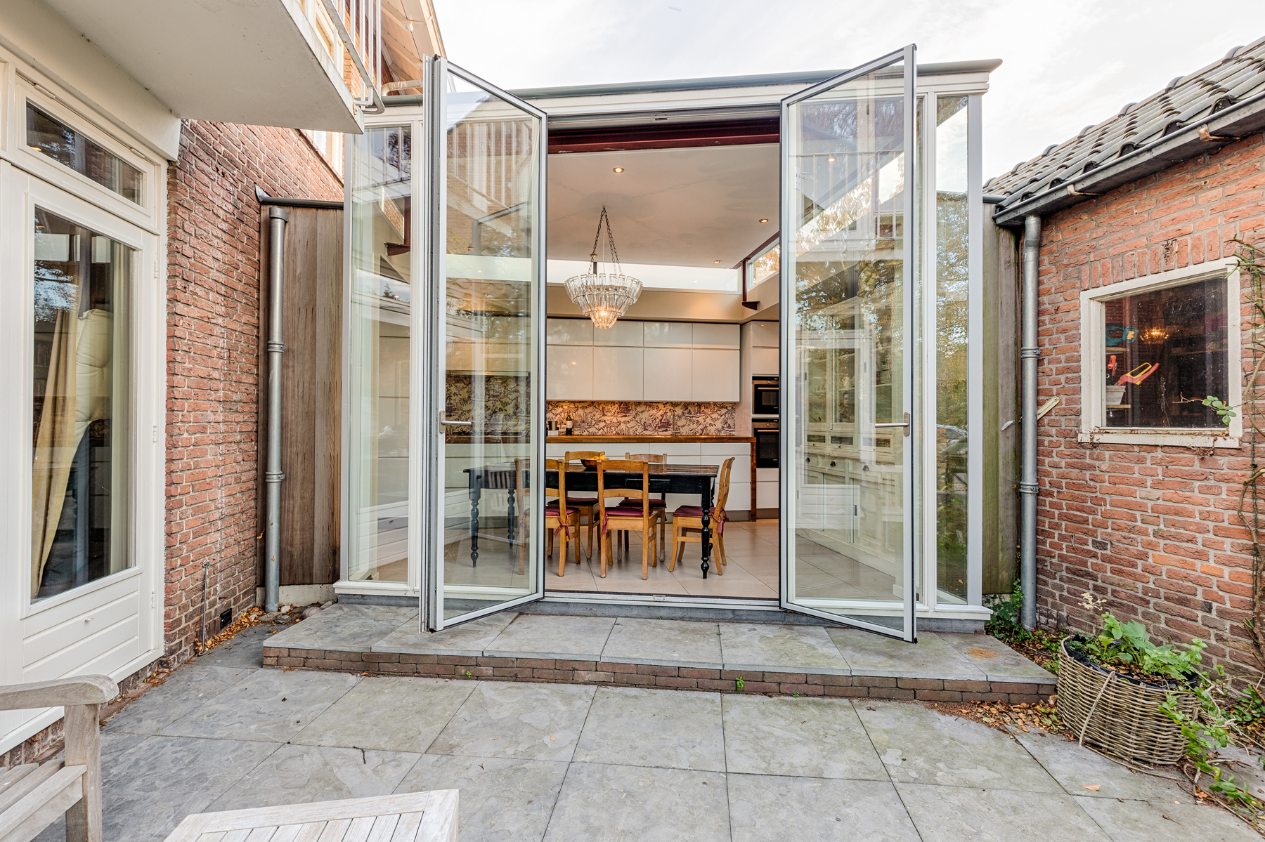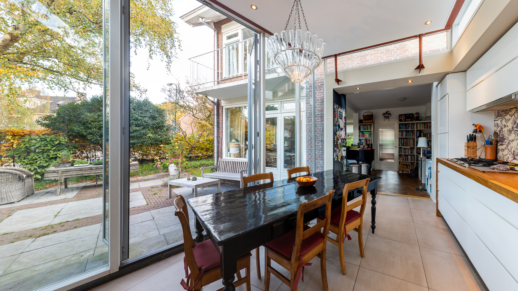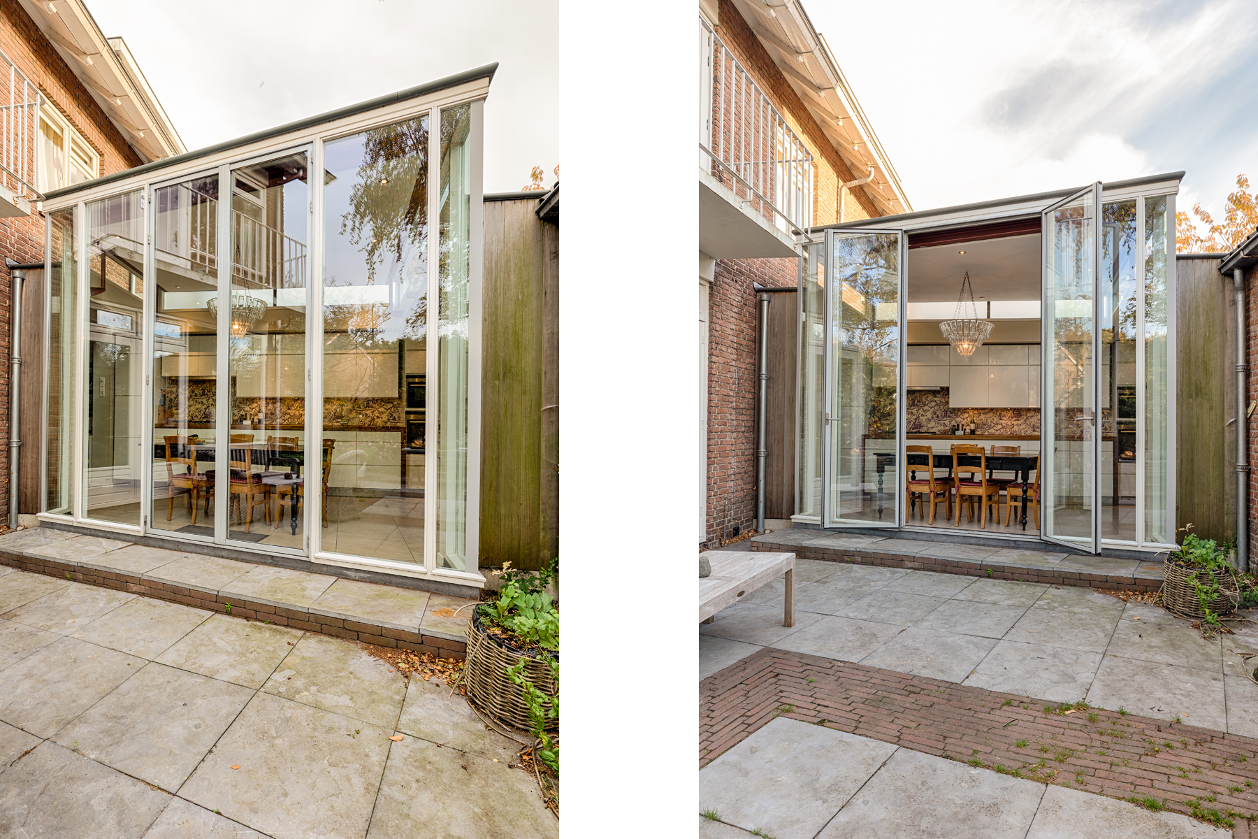 De hoge openslaande deuren verbinden de zijtuin nog meer met de keuken en eetplek.
