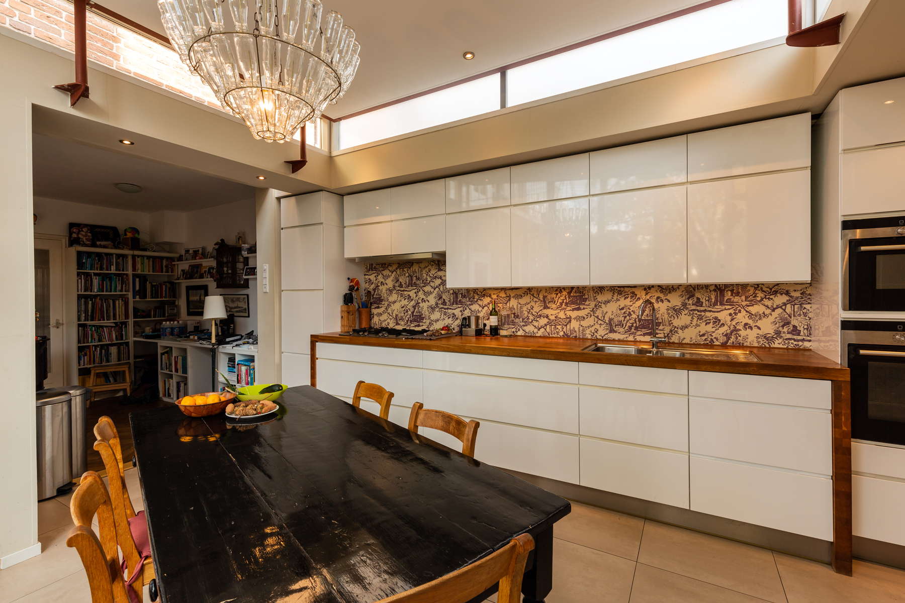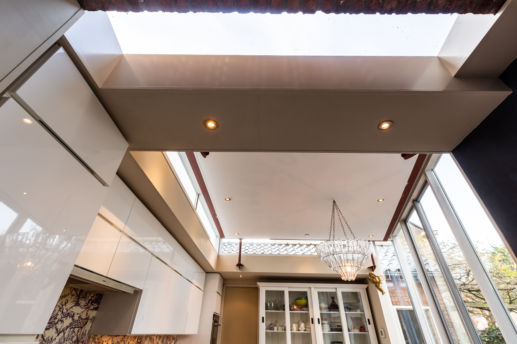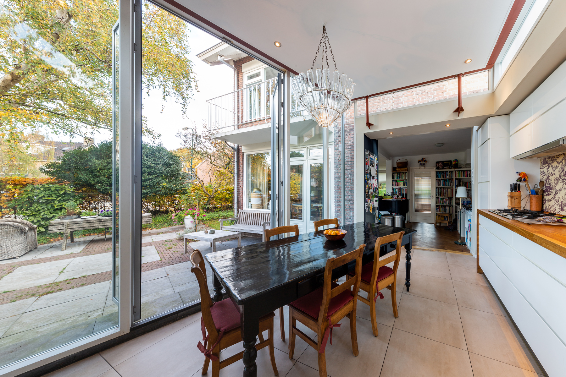 Door een deel van de tussenbouw hoger en breder uit te voeren dan de rest en vorm te geven als een paviljoen is een lichte eetkeuken ontstaan die van vier zijden licht binnenkrijgt en prachtig uitzicht biedt over de zijtuin.