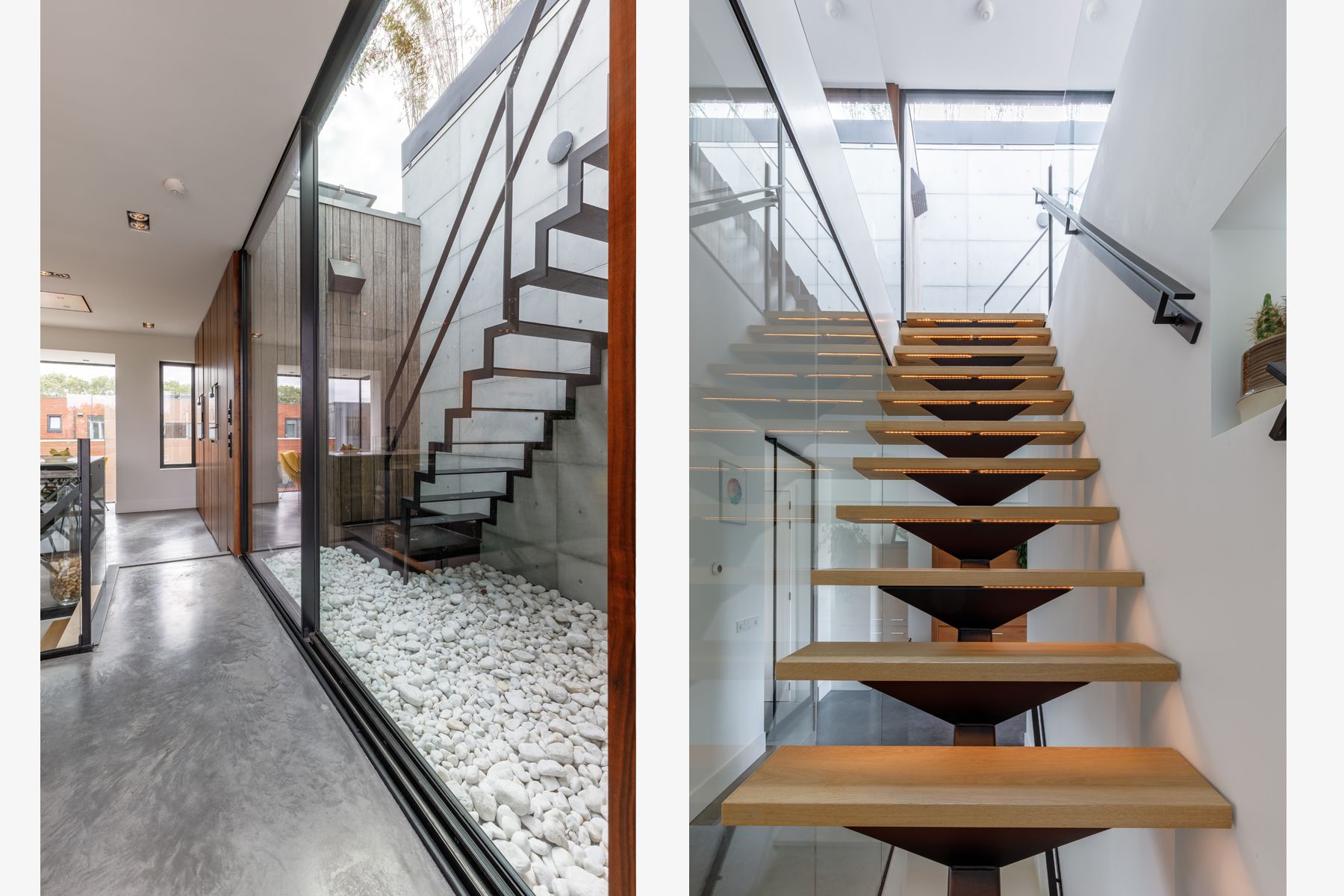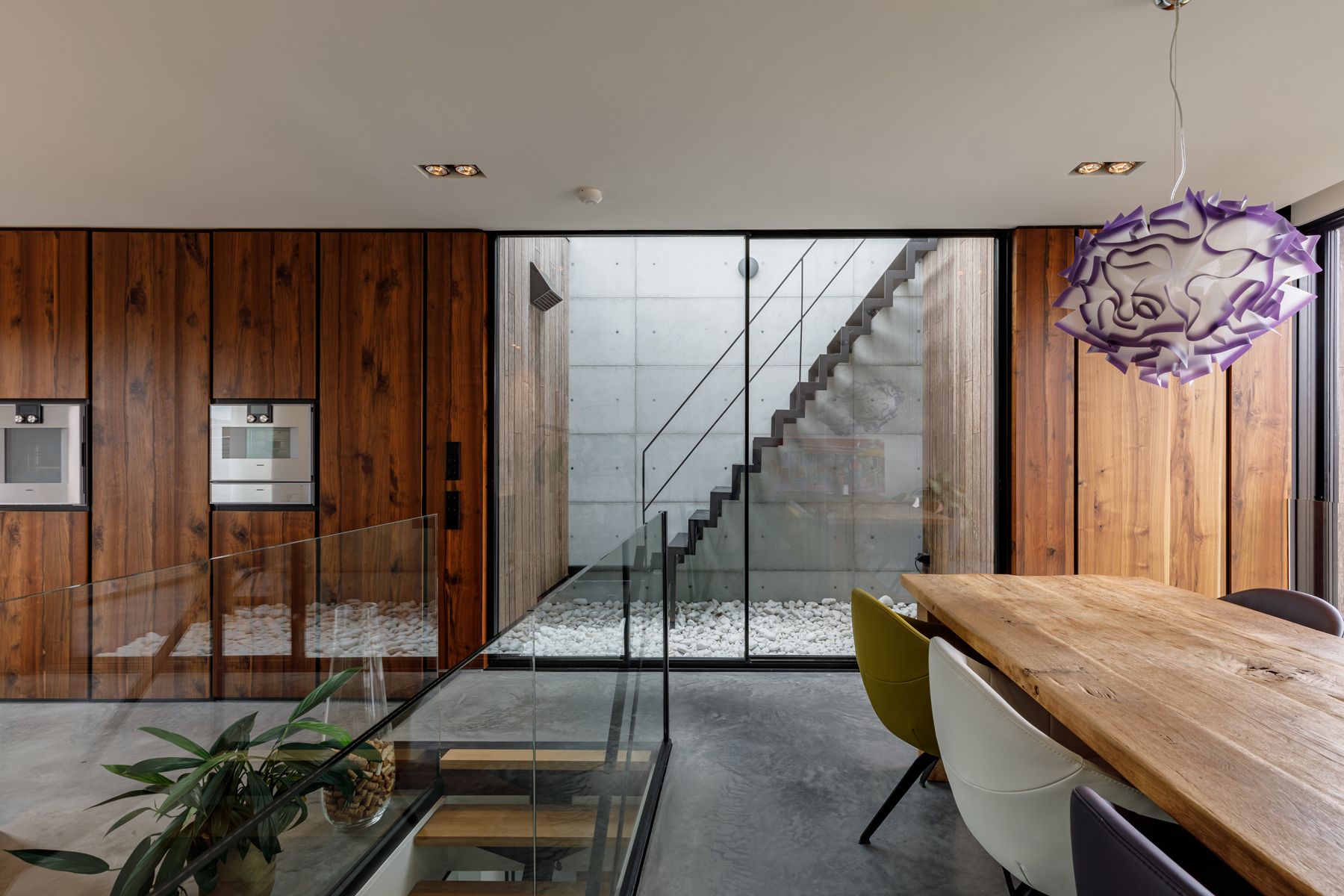 A stepping stone staircase leads directly into the house on the first floor, and a light staircase leads to the top floor with a kitchen and, above that, the roof terrace.