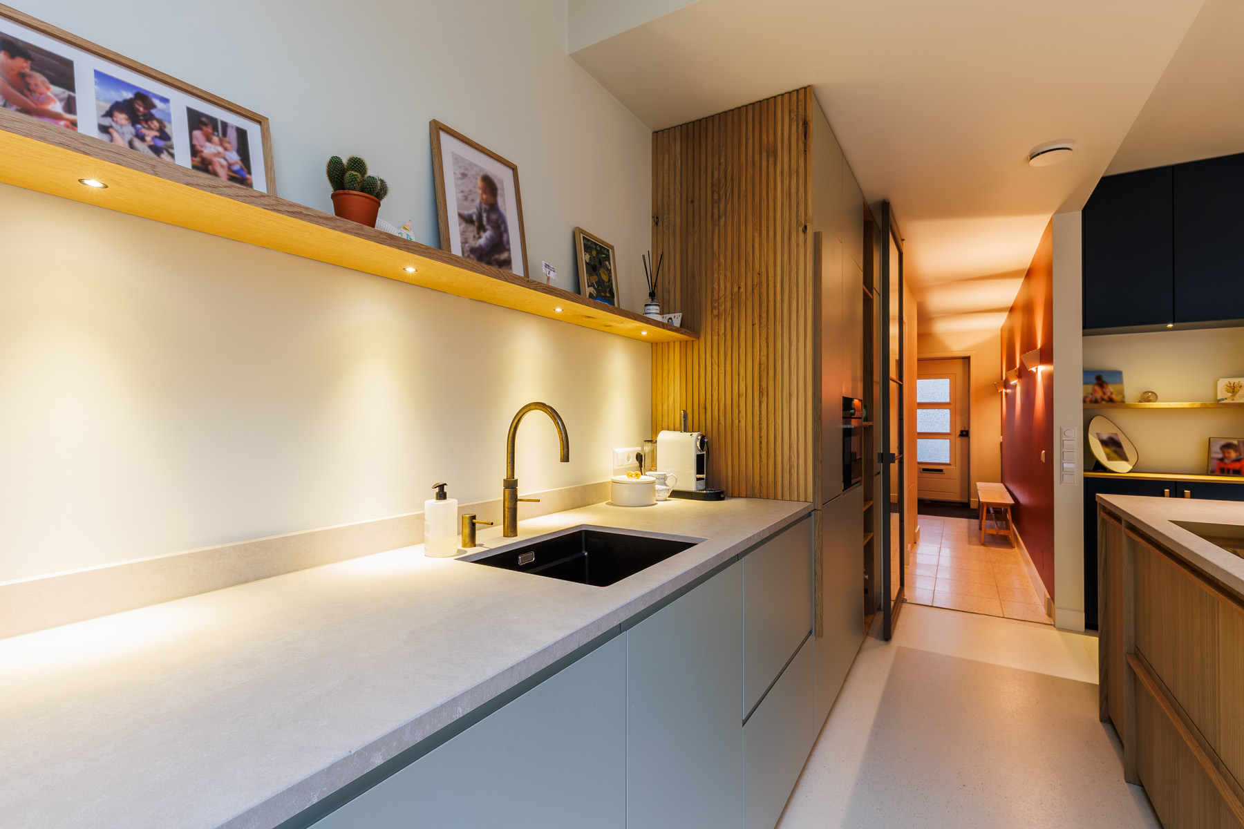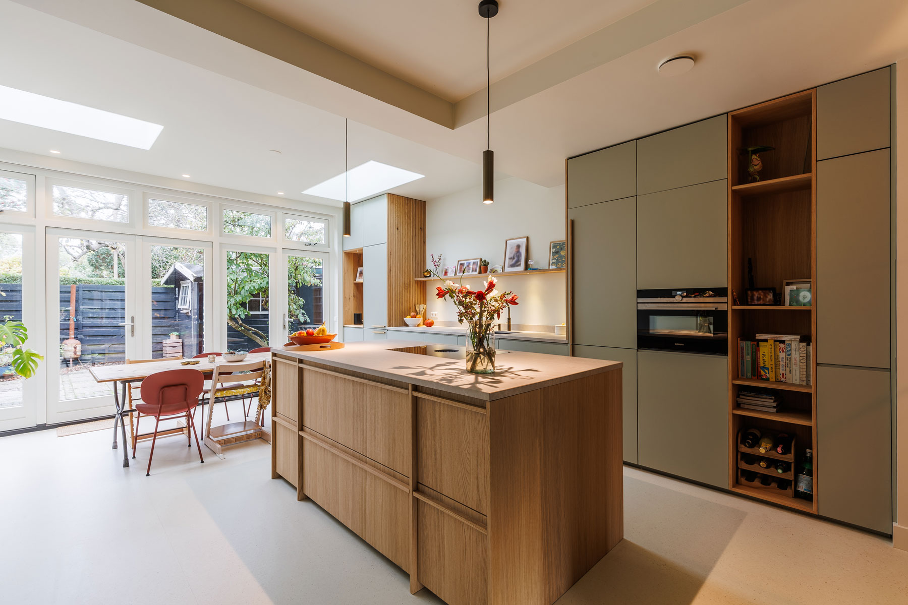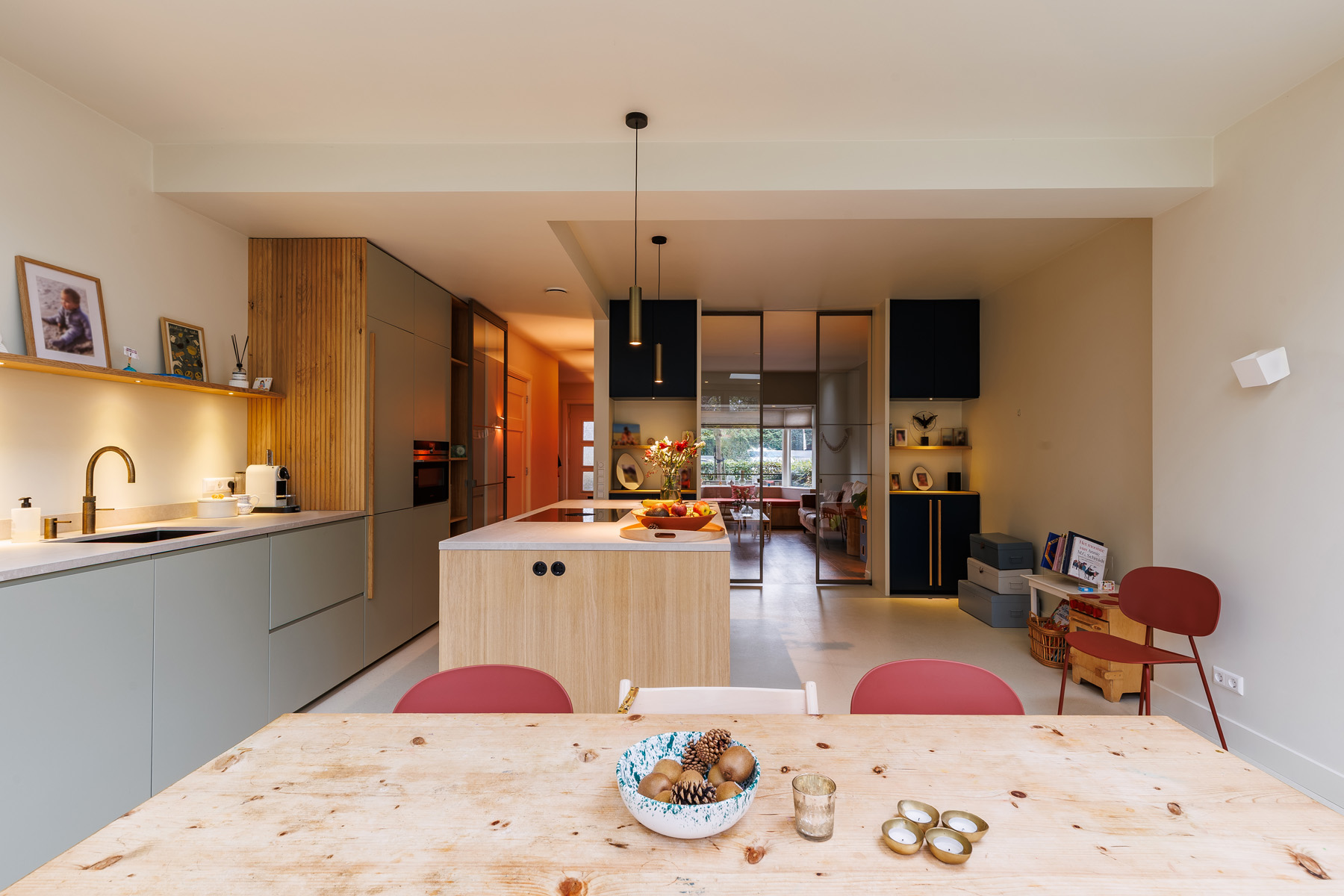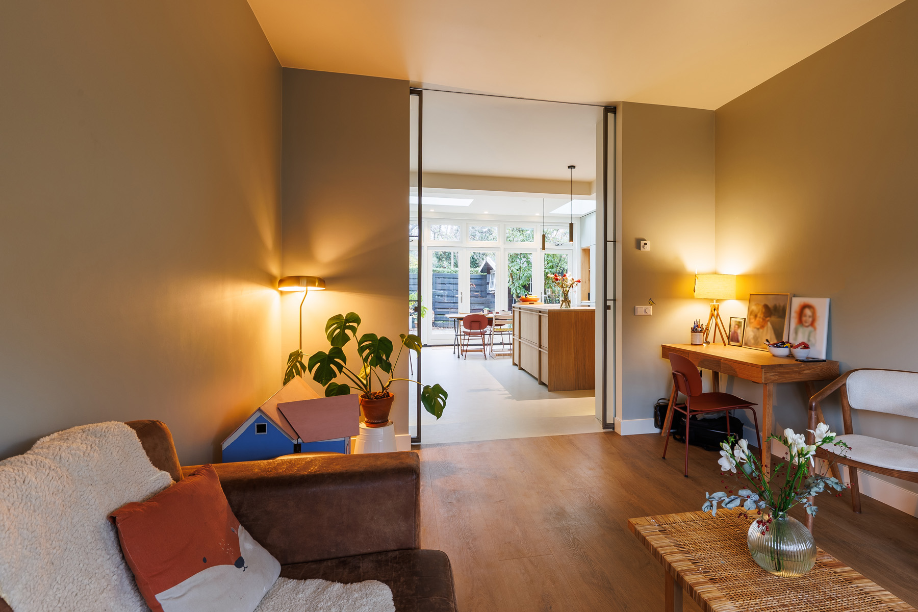 Daarbij is op een moderne manier een ensuitkast met schuifdeuren gemaakt. Op die manier is een nieuwe indeling gemaakt met een rustige zitkamer voor en achter een ruime leefkeuken met voldoende ruimte voor spelen en feesten. De leefkeuken biedt genoeg mogelijkheden om voor verschillende indelingen.