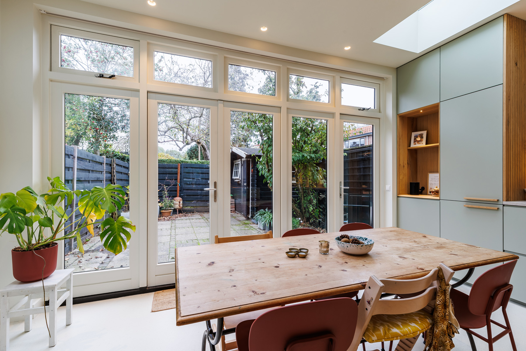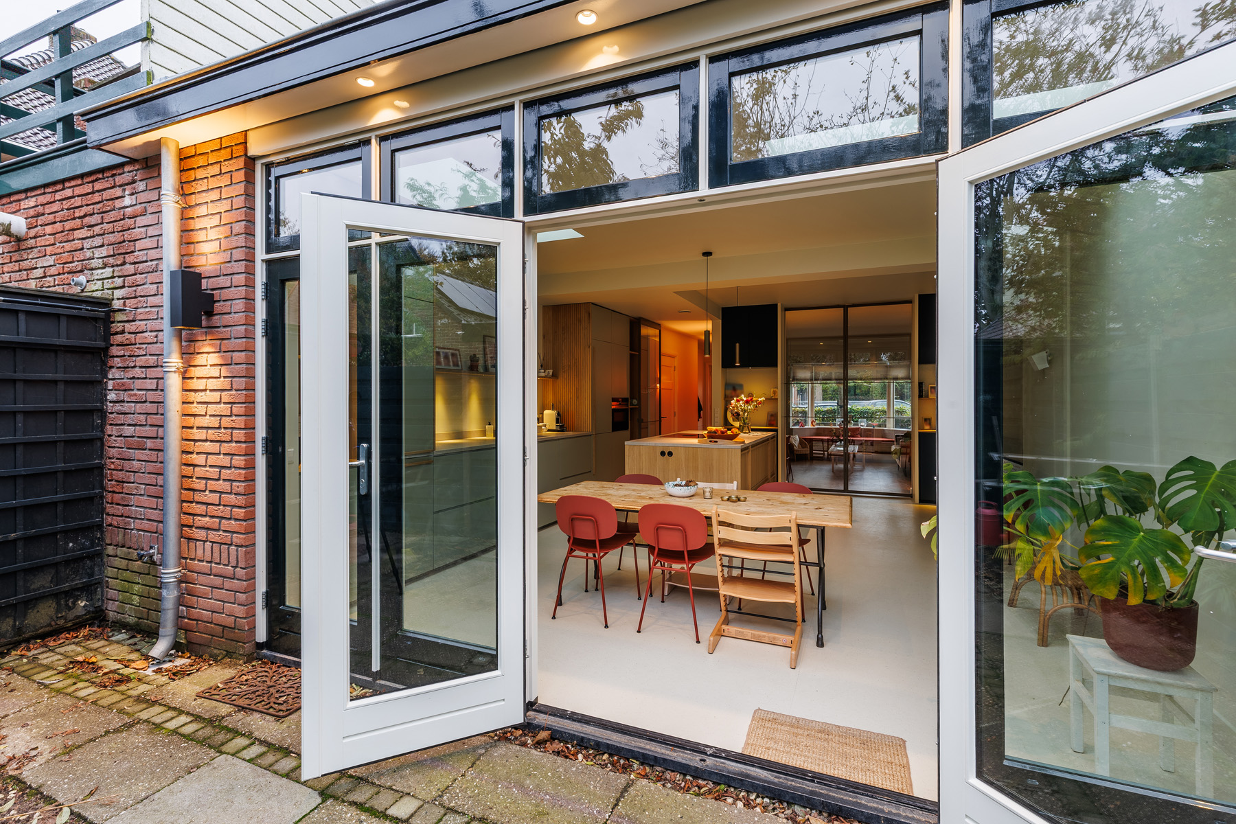 Door de woning uit te breiden met een uitbouw in stijl van de woning is binnen veel ruimte gecreëerd.